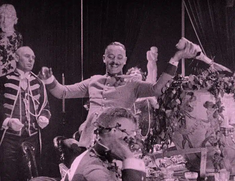 It was easy to fire Erich Von Stroheim because he was forbidden to star as Count Franz Maximilian Von Hohenegg, whose name sounds like a joke. The Count is played by Norman Kerry, one of the silent era’s dashing leads. In what’s clearly a Von Stroheim-directed scene, we see the Count being roused from sleep by his valet. The sleepy Count imagines the valet’s hand on his shoulder must be his sweetheart’s and caresses it while the valet smiles.